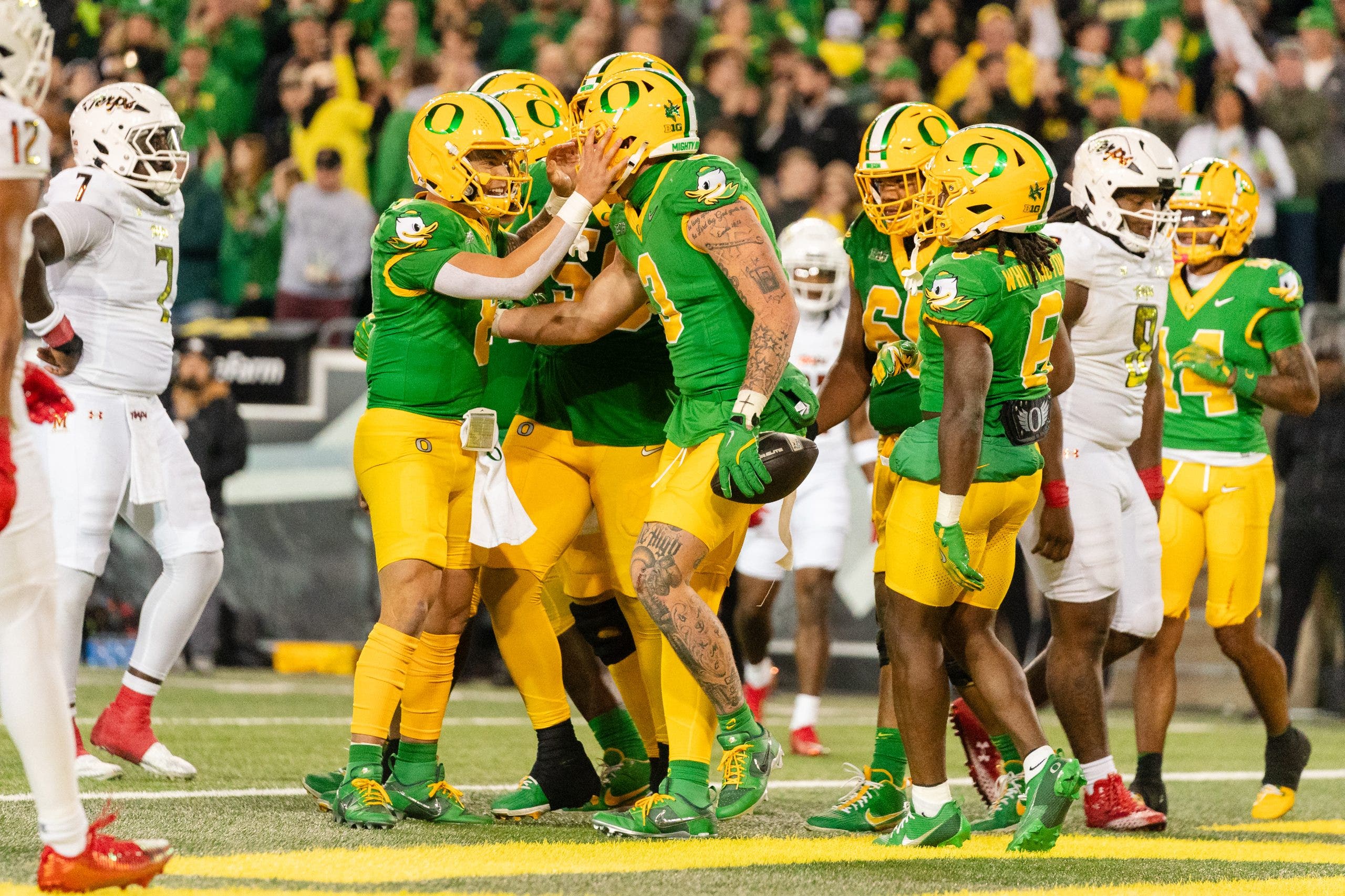 Oregon celebrated three more passing touchdowns from Dillon Gabriel in its win over Maryland. (Photo by Ali Gradischer/Getty Images)
